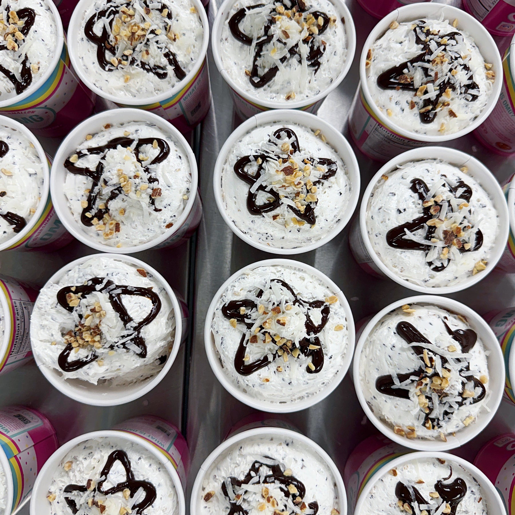 Chocolate Chip - Non High Fructose Corn Syrup, Pure Cane Sugar, Chocolate Shards (Sugar, Cocoa Mass, Low Fat Cocoa Powder, Rapeseed Lecithin, Glazing Agents E414, E904), Water, Kosher Beef Gelatin, Less than 2% of: Vanilla Extract (Water, Artificial Flavors, Caramel Color, Citric Acid, Sodium Benzoate), Salt, Powdered Sugar, Cornstarch, Pan Spray (Sunflower Oil, Sunflower Lecithin, Natural Flavor, Propellant).